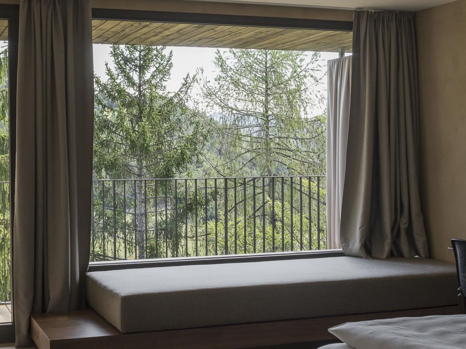 The material palette is deliberately raw and local: exterior cladding of pre-weathered larch, a resilient native timber, contrasts with smooth cement plasters and walnut wood interiors, grounding the spaces in tactile warmth. Sustainability extends beyond certification—there are no televisions, no artificial distractions, just daylight, open views, and the quiet rhythm of the alpine environment. Landscape contributions by Davide Perbellini and Samuel Holzner further amplify the site’s natural drama, ensuring the hotel remains a study in understated elegance within contemporary architecture in South Tyrol.